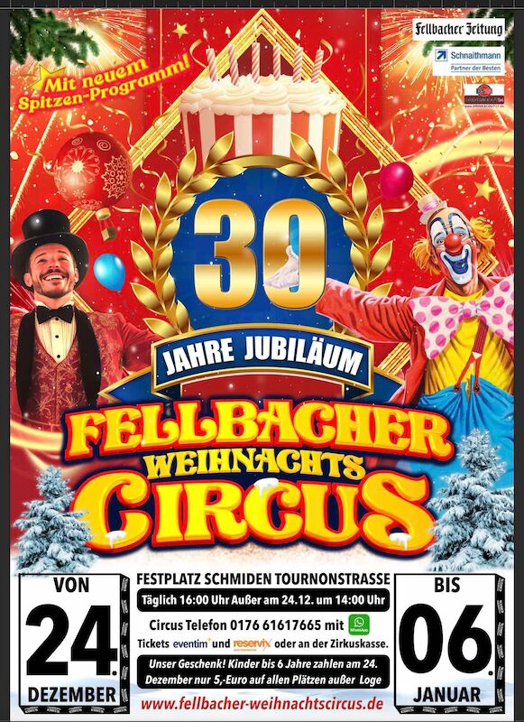 Freizeit Flic Flac Dortmund - Die 14. X-MAS-Show 24.12.2025 Tickets ab 35 EUR König Drosselbart 24.12.2025 Tickets ab 10 EUR Flic Flac Kassel - 16. Festival der Artisten 24.12.2025 Tickets ab 32 EUR Familientag 24.12.2025 Tickets ab 15 EUR Offenburger Weihnachtscircus 2025/26 - Der 28. Offenburger Weihnachtscircus 24.12.2025 Tickets ab 28 EUR Heilbronner Weihnachtscircus 2025/26 - Der 25. Heilbronner Weihnachtscircus 24.12.2025 Tickets ab 23 EUR Flic Flac Duisburg - Die achte X-Mas Show 24.12.2025 Tickets ab 32 EUR Circus Cristallo 2025 - COLOSSAL - die neue Show - Familientag 24.12.2025 Tickets ab 16,50 EUR Flic Flac Bielefeld - BESINNLICH WAR GESTERN! - Die 11. X-Mas Show 24.12.2025 Tickets ab 30 EUR 28. Gelsenkirchener Weihnachtscircus - It’s Showtime 24.12.2025 Tickets ab 24 EUR Fellbacher Weihnachtscircus - 30 Jahre Jubiläum! 24.12.2025 Tickets ab 20 EUR 12. Krefelder Weihnachtscircus - The Power of Life 24.12.2025 Tickets ab 24 EUR PaginierungErsteVorherige1…394395396397398…1027NächsteLetzer