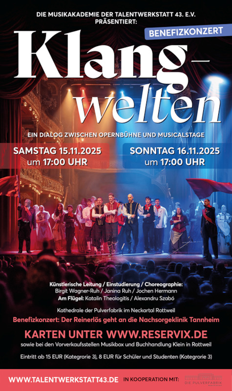 Musicals/Show Carlo der Zauberer 16.11.2025 Tickets ab 10 EUR Theater Liberi 16.11.2025 Tickets ab 25 EUR Die Brüder Löwenherz [9+] 16.11.2025 Tickets ab 9 EUR Das hässliche Entlein - Märchentheater ab 4 Jahren 16.11.2025 Tickets ab 12 EUR A Tribute to Michael Jackson 16.11.2025 Tickets ab 43,45 EUR Internationale Varieté Revue 2025/26 16.11.2025 Tickets Mu-Yu Chen Mu-Yi Chen, Norbert Kegel 16.11.2025 abgesagt Lilo Wanders - "Waren Sie nicht mal Lilo Wanders?" 16.11.2025 Tickets ab 29,70 EUR PETER ORLOFF & SCHWARZMEER KOSAKEN CHOR - DIE ABSCHIEDSTOURNEE 16.11.2025 Tickets ab 42,45 EUR Clemens Bittlinger & Pantomime Carlos Martinez und David Plüss (Piano) 16.11.2025 Tickets ab 28 EUR KulturWelt - Ensemble mit Live - Band 16.11.2025 Tickets ab 26 EUR Musikakademie der Talentwerkstatt 43 e.V. 16.11.2025 Tickets ab 17,60 EUR PaginierungErsteVorherige1…6162636465…673NächsteLetzer
